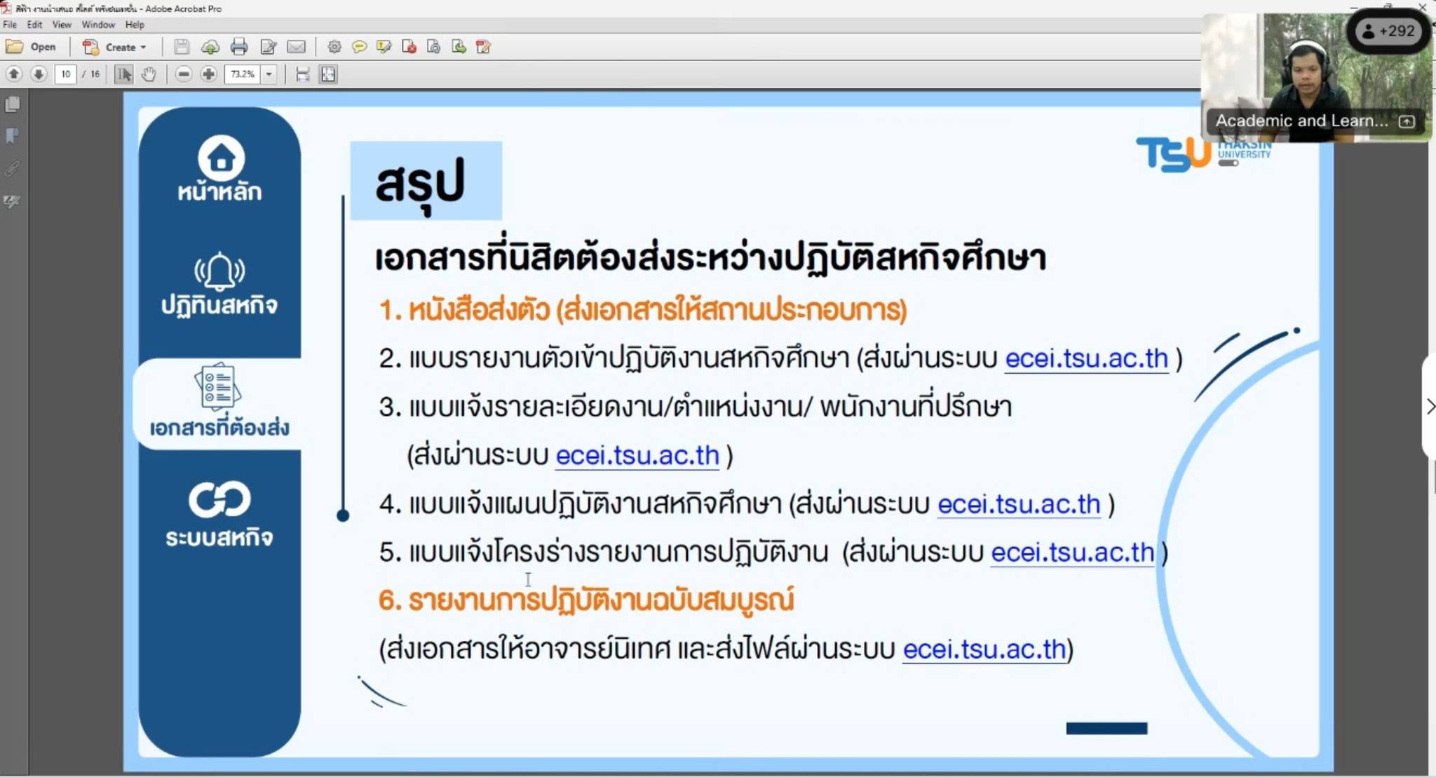 วันที่ 20 ตุลาคม 2568 ฝ่ายวิชาการและการเรียนรู้ มหาวิทยาลัยทักษิณ จัดกิจกรรม “แนะนำการใช้งานแพลตฟอร์มสหกิจศึกษาในกระบวนการระหว่างและหลังการปฏิบัติสหกิจศึกษา” ผ่านระบบออนไลน์ กิจกรรมครั้งนี้จัดเพื่อ เพื่อให้นิสิตและอาจารย์นิเทศมีความเข้าใจในวิธีการใช้งานระบบอย่างถูกต้อง และสามารถนำไปใช้ได้อย่างมีประสิทธิภาพ