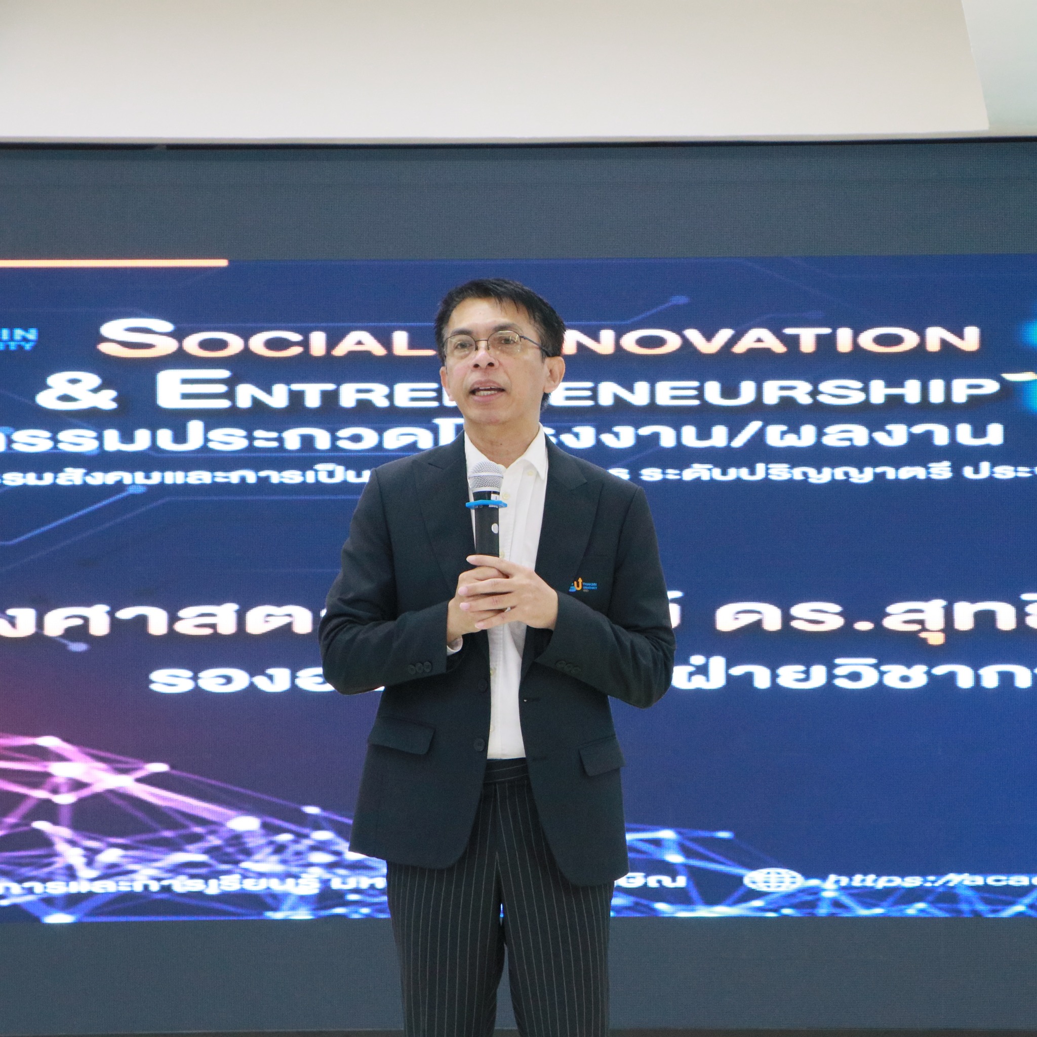 โอกาสนี้ รองศาสตราจารย์ ดร.สุทธิพร บุญมาก รองอธิการบดีฝ่ายวิชาการและการเรียนรู้ ได้กล่าวถึงวัตถุประสงค์ของการจัดกิจกรรมว่า มหาวิทยาลัยทักษิณมีนโยบายมุ่งพัฒนาศักยภาพนิสิตให้เป็นกำลังสำคัญในการขับเคลื่อนการพัฒนาประเทศ โดยเน้นการสร้างสมรรถนะด้านนวัตกรรมสังคมและการเป็นผู้ประกอบการ เพื่อส่งเสริมให้นิสิตสามารถคิดค้นและสร้างสรรค์ผลงานที่เป็นประโยชน์ต่อสังคม และสามารถต่อยอดองค์ความรู้ไปสู่การพัฒนานวัตกรรมที่ตอบโจทย์ความต้องการของชุมชนและสังคมได้อย่างเป็นรูปธรรม