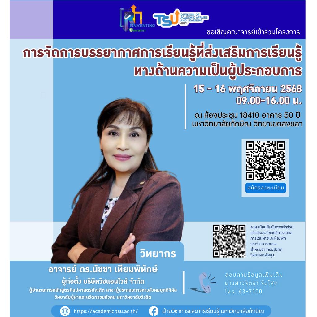 ขอเชิญคณาจารย์ ม.ทักษิณ เข้าร่วมอบรมการจัดบรรยากาศการเรียนรู้ที่ส่งเสริมการเรียนรู้ทางด้านความเป็นผู้ประกอบการ