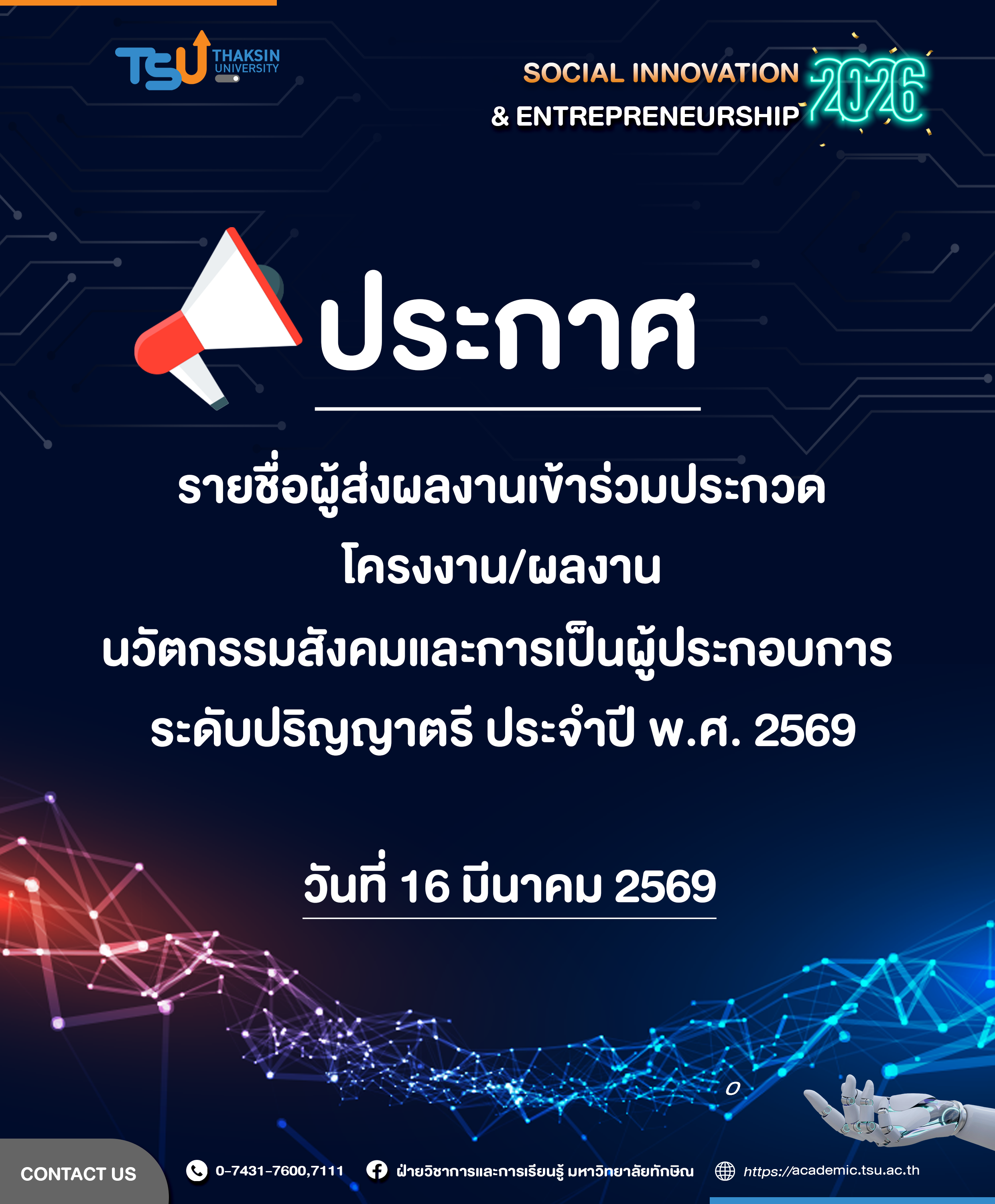 ประกาศรายชื่อผู้ส่งผลงานเข้าร่วมประกวดโครงงาน/ผลงานนวัตกรรมสังคมและการเป็นผู้ประกอบการ ระดับปริญญาตรี ประจำปี พ.ศ. 2569