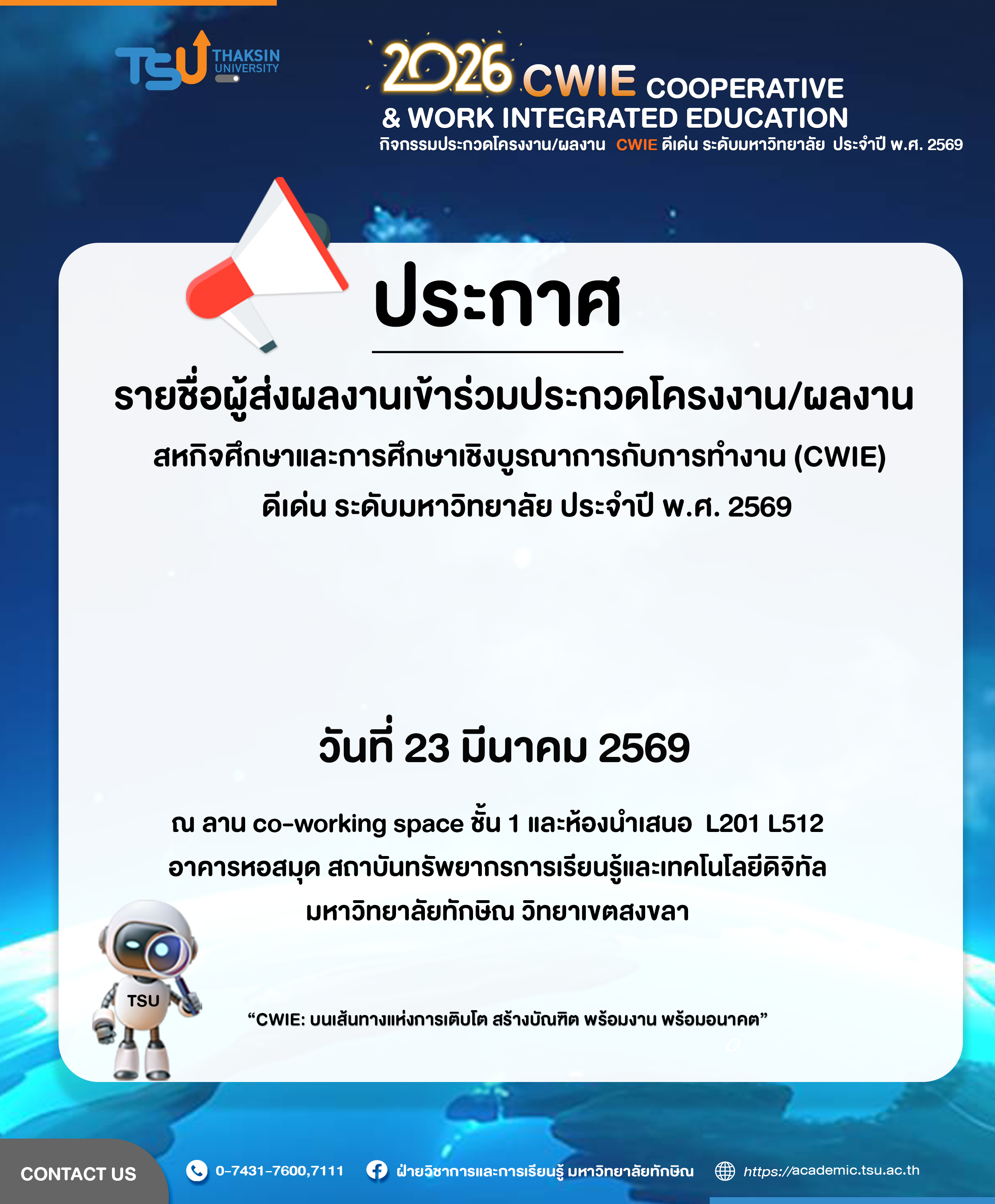 ประกาศรายชื่อผู้ส่งผลงานเข้าร่วมประกวดโครงงาน/ผลงาน CWIE ดีเด่น ระดับมหาวิทยาลัยทักษิณ ประจำปี พ.ศ. 2569